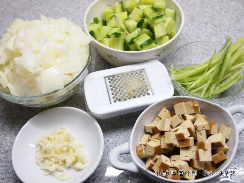 小青瓜洗淨,削不削皮都可以,一半切小丁,一半切細絲;芽菜洗淨;