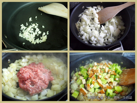 續炒至洋蔥變半透明時,加入豬肉 (圖三),炒散。待肉的顏色變白後,加入青瓜丁、豆腐乾 (圖四),炒勻。