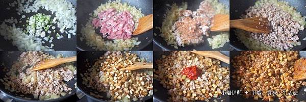 把洋蔥撥到鍋邊,鍋底加入餘下的1茶匙橄欖油,轉大火,油熱後加入豬絞肉 (圖二)。