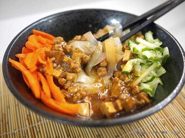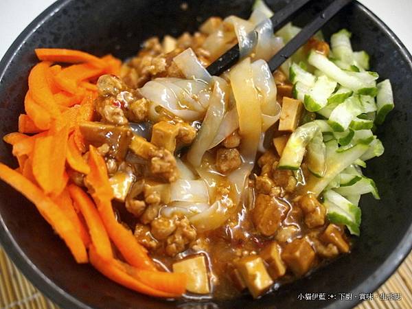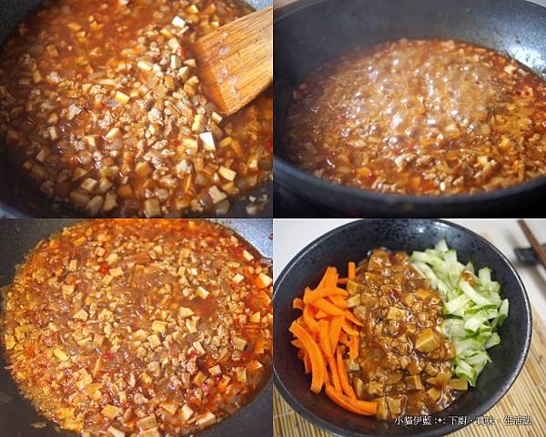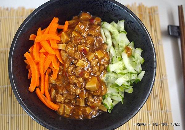 把炸醬淋在寬麵上,放上小黃瓜絲、胡蘿蔔絲 (圖四)。