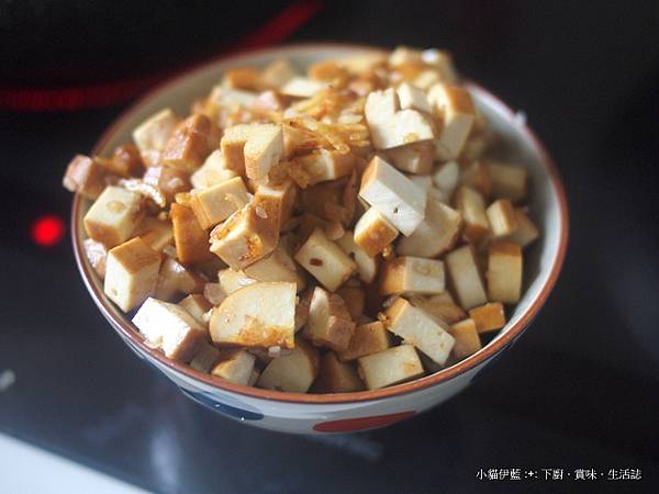 加入五香豆乾丁,轉中火,快手翻炒至豆干表面稍微上色 (圖六),盛起備用。
