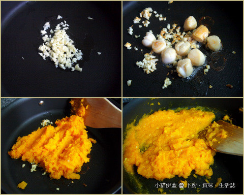 蒜末不要倒掉,原鍋放入南瓜泥,翻炒幾下至飄出香味,加入雞湯/清水,煮至喜歡的稠度。