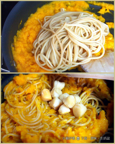 意大利麵煮至九分熟,放入南瓜醬中,拌勻,加入炒熟的帶子,輕輕拌一下。