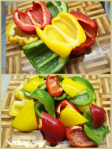 甜椒洗淨、切開去蒂、去瓣膜,再隨意切成大塊。