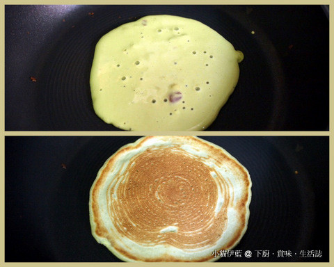 倒入麵糊,小火煎至表面有氣泡,用木鏟翻面,續煎半分鐘,起鍋。