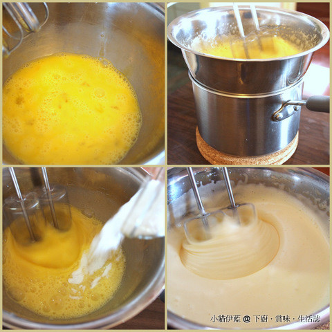 煮沸半鍋水,把蛋液盤放上去,一邊用蒸汽加溫,一邊用電動打蛋器高速打蛋(圖二)。