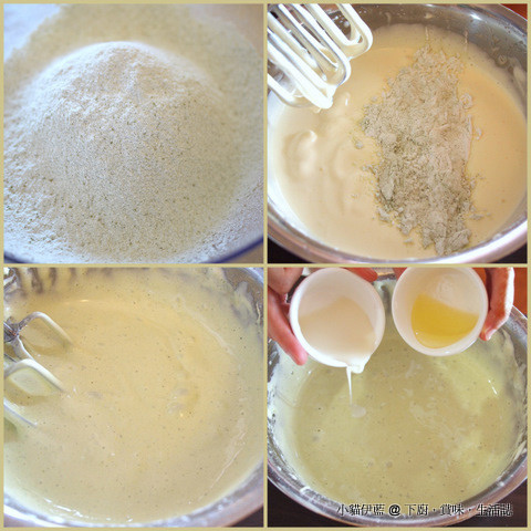 低筋麵粉和綠茶粉預先過篩(圖一)。