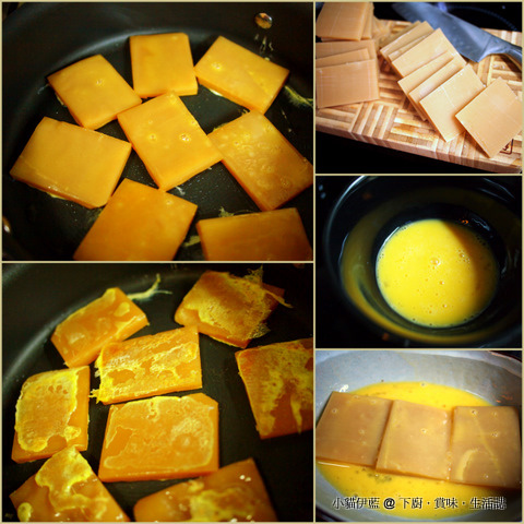 年糕切成薄片 (右上圖),雞蛋打散 (右中圖) 放淺碟中,放入年糕,兩面都沾上蛋汁 (右下圖)。