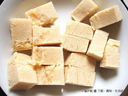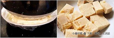 1. 豆腐壓上重物可以排去過多的水份,成品的孔洞就不會太多。不壓重物也可。