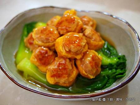 另備鍋子燒水,加點鹽和油 (份量以外),燙熟小棠菜,盛盤。煮好的釀豆卜先夾起,放在小棠菜上面。