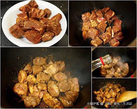 加熱厚底炒鍋,倒入足量的油,油熱之後放入羊肉 (右上圖),大火炒至羊肉表面焦黃 (左下圖),