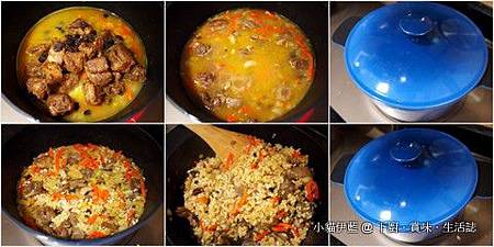 加入羊肉塊和葡萄乾 (圖一),拌勻 (圖二),大火煮滾,轉小火,加蓋續煮15分鐘 (圖三)。