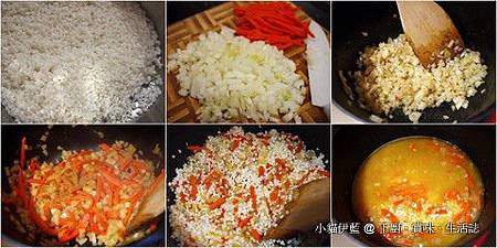 加入白米,續以小火翻炒約1分鐘,讓米粒均勻裹上油份 (圖五)。倒入水 (圖六)。