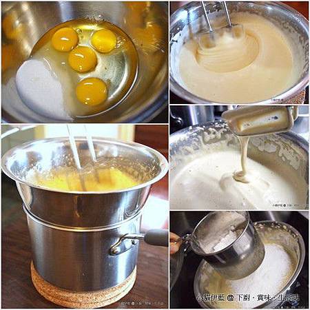 已回復室溫的雞蛋加上砂糖 (左上圖),輕輕打散。