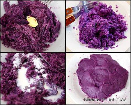 紫心番薯洗淨,放入沸水中煮熟 (約15~20分鐘) 後,剝皮,用叉子壓碎,趁熱加入牛油 (圖一)。