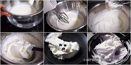 將濃縮藍莓汁/葡萄汁加入鮮奶油中 (圖五),拌勻,放入冰箱待用 (圖六)。