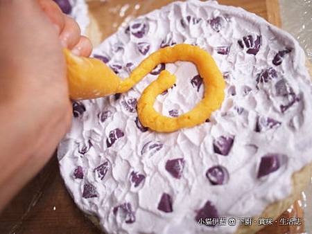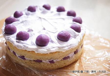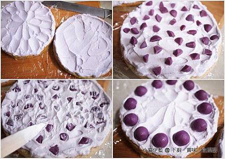 將有花紋的一片蛋糕覆蓋上去,並將剩下的紫薯餡搓成小圓球,放在蛋糕表面 (圖四)。