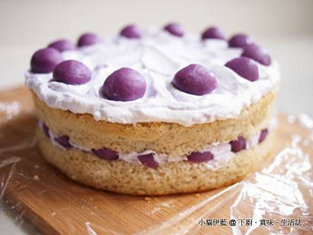 用手將一半紫薯餡捏成小粒,放在其中一片蛋糕的奶油上面 (圖二),再用刀尖將紫薯餡壓進奶油中 (圖三)。