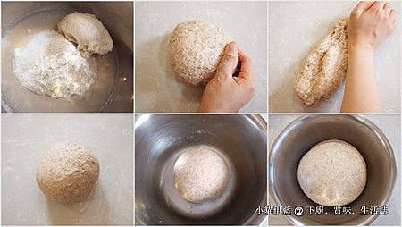 將麵團滾圓 (圖四),收口朝下放在薄薄抹上油的盤子中 (圖五),蓋上保鮮紙,室溫中靜置發酵至2~3倍大 (圖六)。