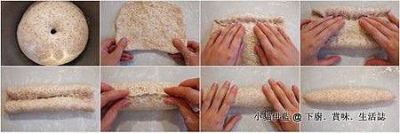 兩側皆向中央捲入 (圖四、五)。再將兩邊的卷狀摺合使麵團緊密捲起,收口用力捏緊 (圖六)。