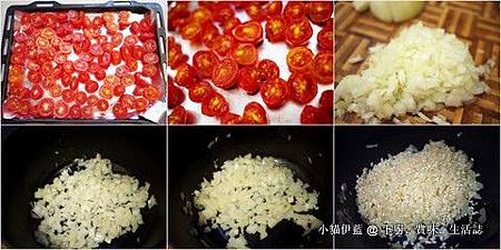 櫻桃蕃茄洗淨,橫向對半切開,切面朝上放在鋪了錫箔紙的烤盤上 (圖一),