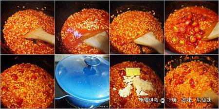 當米粒僅餘一丁點硬芯時,加入烤櫻桃蕃茄 (圖四),拌勻 (圖五),並以鹽和胡椒調味。