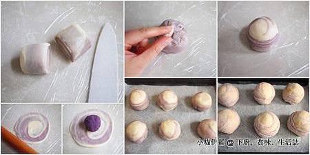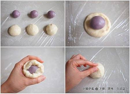 翻轉麵團 (明顯圈圈狀的一面朝下),中間放上內餡 (小圖右),包好並捏緊收口 (中上圖)。