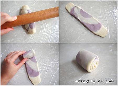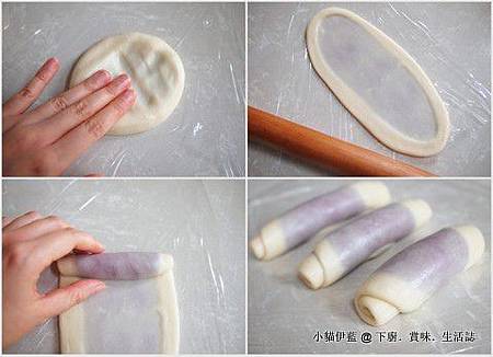 翻轉麵團 (光滑面朝下),由短的一端捲起來 (圖三)。