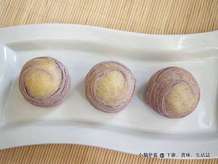 切開麵團後,圈圈的紋路就會出現,可以用手壓扁麵團,以免檊麵棍太用力破壞了圈圈紋。