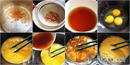倒入已調味的高湯 (圖六),大致地攪勻 (圖七),不必完全打勻雞蛋 (圖八)。