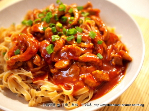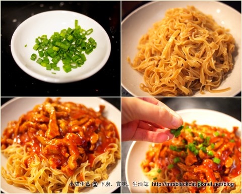 把煮好的炸醬淋在麵上 (圖三),灑上蔥花 (圖四),吃的時候拌勻享用。