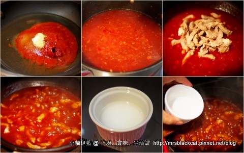 煮沸後轉小火,續煮5分鐘 (圖二)。豬肉倒回鍋中 (圖三),與醬料翻拌均勻 (圖四)。