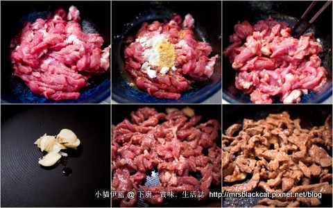 豬肉逆紋切絲 (圖一),加入醃肉料 (生抽、米酒、粟粉、糖、胡椒) (圖二), 拌勻 (圖三)。