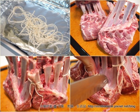 烤盤鋪上錫箔紙,預備一段長長的棉繩 (圖一)。羊架分切成4份,洗淨,以廚房紙巾印乾 (圖二)。