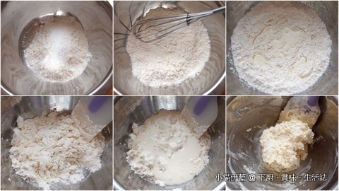 先加入1/4的鮮奶油 (圖三),攪拌一下 (圖四),再倒入剩下的鮮奶油 (圖五),拌勻成團 (圖六)。