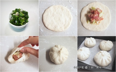 蔥洗淨,切成蔥花 (圖一)。鬆弛好的小麵團壓成圓扁形 (圖二),中間放上菜肉餡 (圖三)。