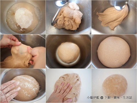 機器搓揉約15~20分鐘 (材料成團之後計),手工搓揉的詳細做法和秘訣請參考:「基礎麵包麵團」