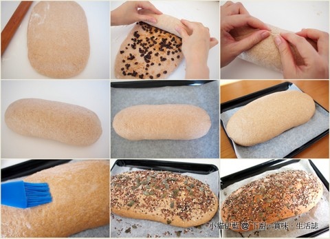 以小刷子在麵包表面塗上一層蛋白 (圖七),灑上混合種籽 (圖八)。