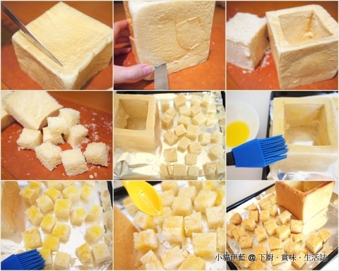 用手輕輕把吐司的中芯抽出來 (圖三)。空盒子四邊修整一下,吐司中芯切成小方塊 (圖四)。