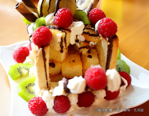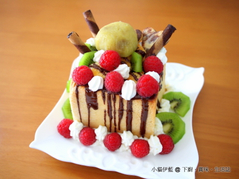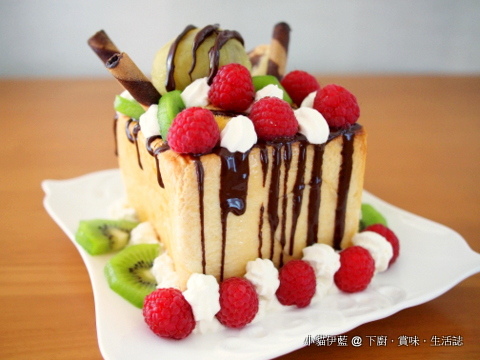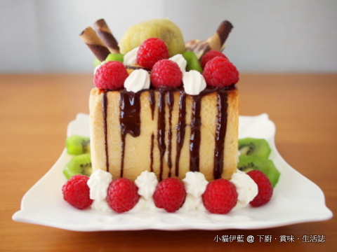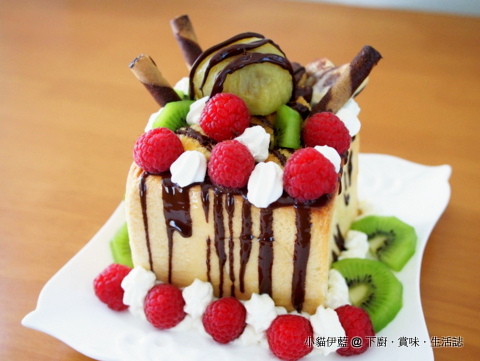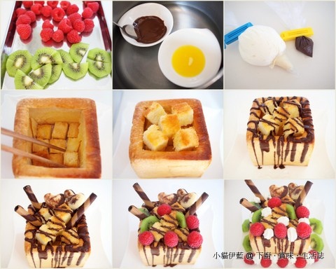 飾上覆盆子、奇異果 (圖八),最後在吐司上面和底部周圍擠上打發鮮奶油 (圖九)。