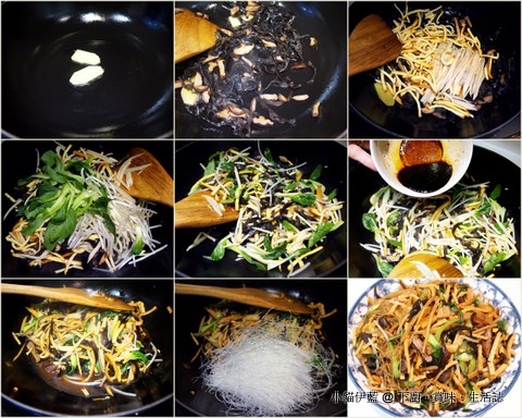 轉大火,加入香菇絲、木耳絲,炒軟 (圖二),續加入豆乾絲、冬筍絲,拌炒均勻 (圖三)。