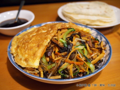 蛋餅之下,整碟都是素菜嘛,那就是「和尚」了;加上大大一塊蛋餅,就是「戴帽」囉~