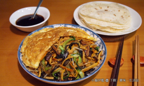 把蛋餅蓋上炒好的菜料上面;佐以甜麵醬和蒸到熱騰騰的荷葉餅佐吃~