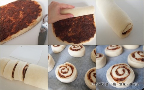 平均地在麵皮上抹一層肉桂糖餡 (圖一),從短端緊密捲起 (圖二),收口捏緊,朝下放 (圖三)。