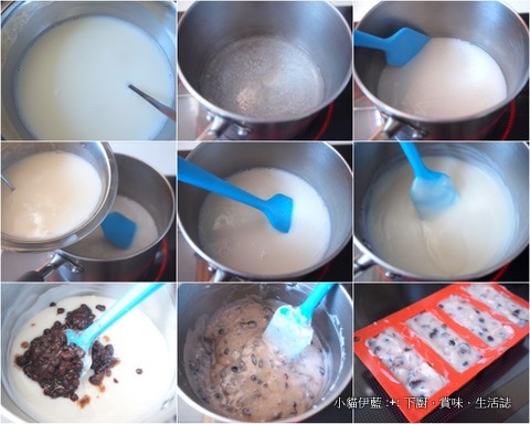 緩緩倒入粟粉牛奶 (圖四),一邊持續攪拌 (圖五),糕糊會很快變稠 (圖六)。