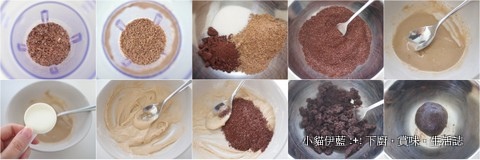 將可可粉、赤藻糖粉、亞麻籽粉放入盤中 (圖三),拌勻 (圖四)。