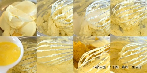 奶油乳酪攪拌成軟滑狀 (圖二),加入砂糖、香草精 (圖三),攪拌混合均勻 (圖四)。