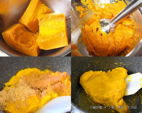 南瓜蒸或烤熟 (圖一),壓成泥狀 (圖二),取100克用。