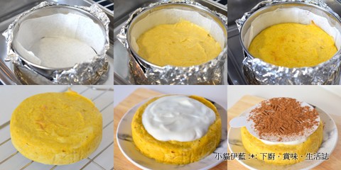 在蛋糕表面抹上酸奶油 (圖五),再灑上南瓜派香料或肉桂粉 (圖六)。