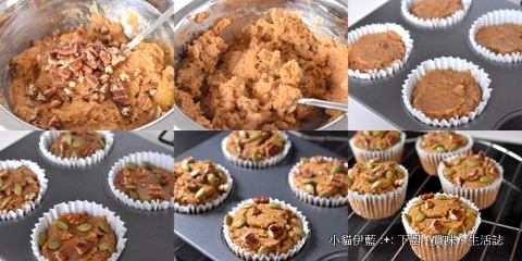 麵糊填入瑪芬紙杯中至8~9成滿 (圖三),表面灑上剩下的1/3山核桃和南瓜子 (圖四)。